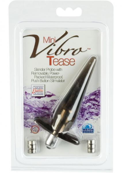 Mini Vibro Tease Probe Smoke. Waterproof slender probe with removable, power-packed, push button stimulator. Safe and pure for body and pleasure. Made using phthalate free, non-toxic materials Thermoplastic Rubber TPR probe, ABS plastic with silver plating stimulator. Vibrating sex toy requires batteries 3 watch size to power up, 6 included. Probe measures 4 inches long by 1 inch wide. A water based lubricant is recommended.
