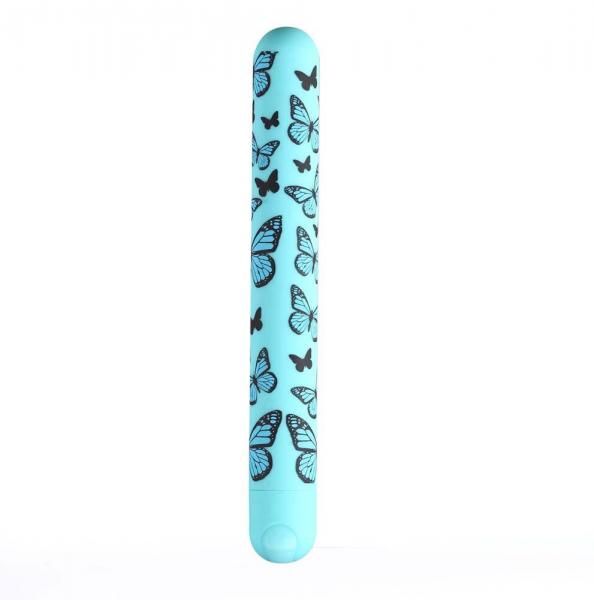 Monarch Butterfly Pattern Long Rechargeable Bullet Vibrator name on package Monarch Rechargeable Massager from Maia Toys. Float like a butterfly and lift your orgasms with silky soft wings with the Maia Novelties Monarch. This 10 Function Rechargeable Bullet Vibrator is coated with silky soft Silicone that is 100% body safe. The Butterfly print design belies a soft yet powerful motor. The long, slender design allows for easy handling and multiple uses while the end position control button allows for easy speed change. Our Monarch sheds water with its 100% submersible design. The Maia Novelties Monarch measures 6 inches in length and is approximately .75 inch wide and includes a USB Charging Cable. All our rechargeable products include our 1 Year Replacement Warranty. Specifications: Color Teal Blue with Butterfly Print. Functions: 10 speeds of pulsating vibrations. Strong motor. Silicone coating. USB Rechargeable. Waterproof vibrations and submersible for bath tub play. Item dimension: height .8 inch, width .8 inch, length 6.4 inches. Bulk weight 1.6 ounces. Package dimensions height 3.1 inches, width 1.2 inches length 7.9 inches. Package and Product Weight: 2 ounces.