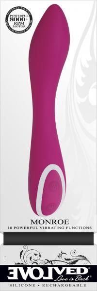 Monroe Pink Vibrator from Evolved Novelties. Sometimes a woman needs extra power for that ultimate sensation! The robust motor in this traditional shaped vibe delivers formidable vibrations, with 10 different functions to choose from. Creamy smooth silicone and a gently flexible shaft move with your body as you enjoy the tantalizing feel of the slightly bulbous tip that tapers to a point for precision when you want it. Bring this commanding vibe into the bath or shower with you, as it is completely submersible, and clean with Evolved Toy Cleaner and a warm water rinse.