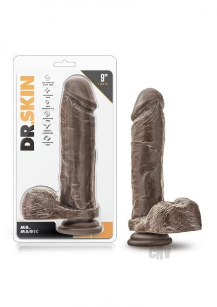 Dr. Skin Mr. Magic 9 inches Dildo with Suction Cup Chocolate Brown. The doctor is in! If you need a tool that is always ready, grab a hold of Mr. Magic 9 Inches Realistic Dildo with Suction Cup. Sculpted with detailed veins and skin texture, he will drive you crazy. This dildo is ultra thick shaft and big head are enough to satisfy the most demanding appetite. Experience his 7.5 insertable inches and 2 inches of girth by yourself or with a partner. He is equipped with a strong suction cup and is harness compatible for extreme partner play. He is realistically formed veins, texture, balls and all from lab certified body safe non-porous PVC. Contains no synthetic fragrance or latex. To clean, wash with soap and water or a toy cleaner. Pat dry with clean towel then let air dry. We recommend storing your product in our Safe Sex Antibacterial Toy Bags. 9 inches in total length by 2 inches in width, insertion length 7.5 inches.