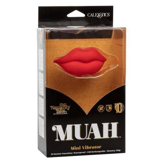 Naughty Bits Muah Mini Vibrator from California Exotic Novelties. Talk about a cheeky design! The Naughty Bits Muah Mini Vibrator is a fun red lip massager that is actually a hand held miniature vibe design, wrapped in body safe silicone. Sure to be the talk of the town with a thirty minute run time on the high setting and 2 full hours on low, you can kiss your old vibe goodbye! With a 10 function vibration setting and a single button control, you can use these waterproof lips to bring yourself to climax on land or at sea or in the shower. The USB rechargeable design ensures you get a taste of power no matter where you are located, bringing the lips to a full charge in just 2.5 hours. Measuring out at 3.25 inches, this product is truly a mouth full, ensuring a deep, strong massage anywhere on your body. So pucker up and take control with the cute and sexy Naughty Bits Muah Mini Vibrator. Specifications: ColorRed. MaterialsSilicone. Power source USB Rechargeable, included. Features Phthalate free, Waterproof, Rechargeable, Vibrates. 1 year warranty. Maximum run time120 minutes. Maximum charging time 150 minutes.Measurements 1.75 inches by 3.25 inches by 1.5 inches. Bulk weight 1.4 ounces. Package 4.7 ounces. Package 2.25 inches by 4.5 inches by 8.25 inches.