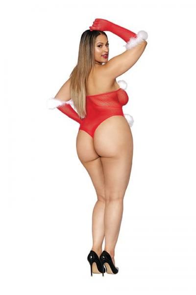 Naughty List Seamless Fishnet Santa Teddy Lipstick Red Q/S for Dreamgirl Lingerie. Seamless fishnet Santa teddy with marabou feather accents featuring: strapless neckline and thong back. Matching fishnet gloves. Size queen size, plus sizes. Ladies plus size, queen. Sizes 16 to 20. Cups D/DD. Bust 40 inches to 54 inches. Waist 36 inches to 44 inches. Hips 42 inches to 56 inches. Weight 165 pounds to 275 pounds. Categories: Teddies, Xmas items, Plus Size, Holiday Items. Restricted, Amazon Restricted. 2022.
