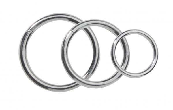 Spartacus Leathers Cock Gear Metal Cock Rings: Nickel Metal Ring 3 Piece Set. One each 1.25 inches, 1.75 inches and 2 inches. Metal cock rings made with welded nickel. Cock rings when worn around the base of penis and testicles, many users find that cock rings increase sexual pleasure. Single metal cock rings, your choice of sizes, in nickel or black. Each sold separately. Spartacus A Passion For Quality Catalog. Made in the USA.