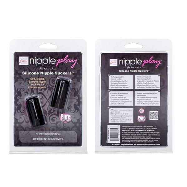 Nipple Play Silicone Nipple Suckers Black 2 soft, pliable Silicone nipple suckers for intense arousal. Soft and squeezable. Incredible suction for increased sensitivity. Safe and pure for body and pleasure made using phthalate free materials Silicone. Bulk weight 0.7 ounce. 2.25 inches by 1 inch. Unisex for him or her.