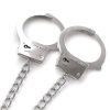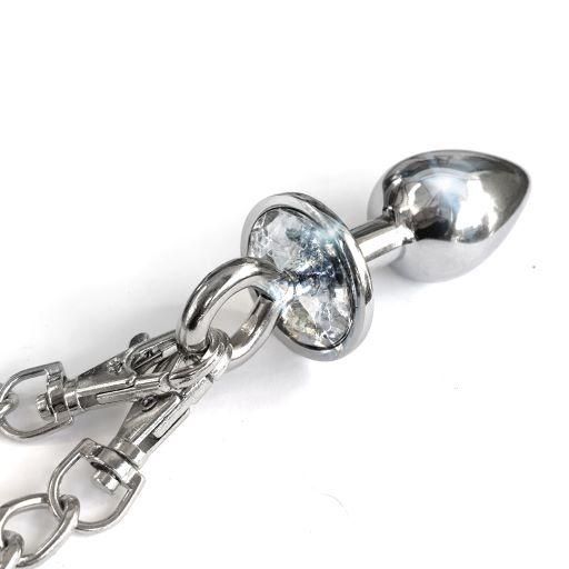 Anal play and bondage all in one! Silver metal cuffs chained to a detachable purple sparkling jewel butt plug. Smooth-plated slick metal finish in lightweight aluminum alloy. Lockable metal novelty handcuffs with click-release clasp. Butt plug 2.75″x 1″and handcuffs are on a 9″detachable chain.