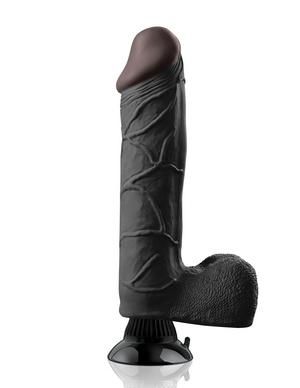 Real Feel Deluxe No. 11 Black 12.75 Total inches Realistic Vibrator with Wallbanger Suction Cup Technology. Flesh Enjoy the Real Feel of velvet soft, lifelike skin with this incredibly realistic vibe. Meticulously designed with a pronounced head, bulging veins, and free hanging balls, the super lifelike shapes, textures, and colors of this vibe truly look and feel like the real thing! Made with phthalate free Fanta Flesh, this squishy material mimics the softness of real skin and is completely body safe. The ultra strong suction cup base sticks to nearly any smooth, flat surface for a wall banging good time! Stick it to the floor, wall, tile or bedpost the super-strong suction cup will stay securely in place during every passionate thrust, and features a quick release tab for easy removal. The sturdy suction cup doubles as a harness compatible base that remains snug in its place even when the action heats up. Wear this vibrating dildo with any Fetish Fantasy Series harness for the most comfortable and realistic strap on experience! Insert the required batteries, screw the base completely on until it is tight, and the vibe will immediately turn on to offer powerful vibrations for the most intense orgasm you have ever imagined! To power down, simply unscrew the cap and the vibe will turn off. Take this completely waterproof vibe in the shower, hot tub, or spa and turn bath time into pleasure time! Use plenty of Moist Personal Lubricant for an extra wet and wild experience. Cleanup is a snap after the fun with Pipedream Toy Cleaner and warm water. Insertable Length 9.5 inches, Diameter: 2.5 inches, Length 11.25 inches, Width 2.5 inches, Height 2.5 inches, Girth 7.5 inches, Diameter 2.5 inches. Weight 2 pounds. Features and Functions: Realistic (Fanta Flesh), Phthalates Free, Suction Cup, Waterproof, Harness Compatible, Vibrates. Battery Information: requires 2 AA batteries, not included. Materials:Thermoplastic Rubber (TPR), ABS Plastic, PVC. Country of origin: China. Pipedream Products Catalog featured in 2014 Real Feel Deluxe, page 12.