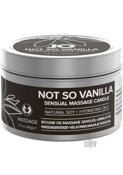 JO Not So Vanilla Soy Massage Candle will awaken your passion. Directions: Light the candle and let burn for 30-40 minutes to create oil. Extinguish the flame and carefully test the wax to ensure a comfortable temperature. Pour the warm massage oil onto partners skin. Warning: To prevent fire and serious injury burn candle within sight. Keep away from draft and vibrations. Keep out of reach of children and pets. Never burn candle on or near anything that can catch fire. Burning Instructions: Trim wick to ?? inch before lighting. Keep candle free of any foreign materials including matches and wick trimmings. Only burn candle on a level fire resistant surface. Do not burn candle for more than 4 hours at a time.