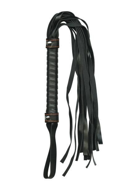 Wonderfully sized flogger with leather like strands and strong, sturdy handle. Sexy orange stitched accents add a touch of fashion and intrigue and there is even a handy strap for easy carrying.
