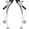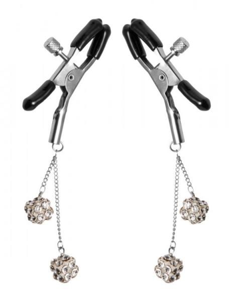 This sparkling set of rhinestone adorned nipple clamps will give you a dazzling way to make sure their eyes stay on you! The cube shaped embellishments are set on all sides with clear sparkling gems which catch the light with every movement. The clamps themselves are vinyl coated, with a thumb screw that allows you to adjust the tightness as you need it. The adjustable pressure make them ideal for all experience levels.