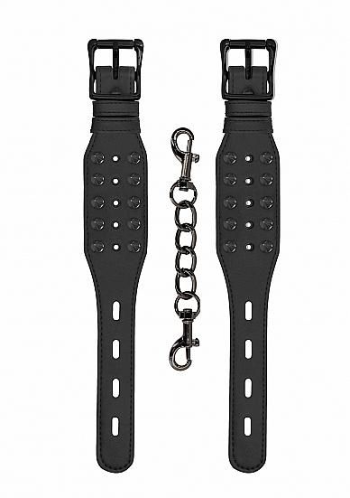 Ouch! Skulls and Bones Handcuffs with Spikes Black from Shots Toys. With two rows of impressive spikes, a double clasp on each handcuff and a sturdy, detachable, metal connection, this bracelet shows you mean business. Made of high quality black Bonded Leather and dark gray metal, these Skull Handcuffs always come in handy!