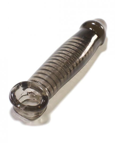 Super soft Flex-TPR cock sheath has soft ridges that add massage sensations. For a tighter fit, a small silicone stopper locks into the grooved indents at whatever length suits you. Measures 9.25 in. long, 8 in. insertable, with a circumference of 6 in.