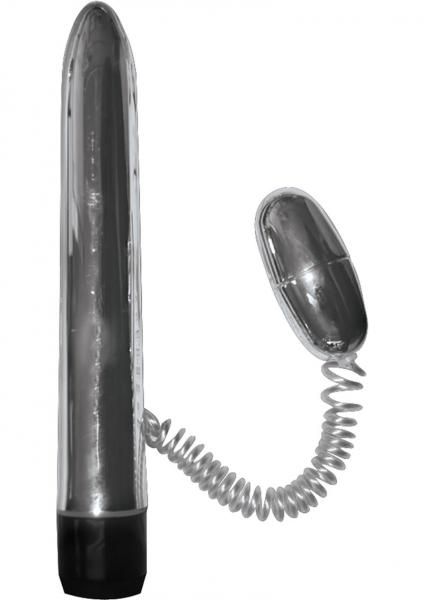 Silver slimline 7 hard vibe with attached 2 silver bullet works simultaneously to hit 2 erogenous zones at once. Ultra Quiet and Powerful. Multi Speed. 2 AA batteries required.