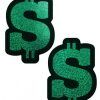 Money Green Glitter Dollar Sign Nipple Pasties by Pastease Brand are hand made in the USA of soft form fitting glittery material that forms seamlessly to curves and resists wrinkling over hardening nipples. Just peel and stick on clean, dry skin. Our green glitter dollar sign nipple pasties feature a latex free, medical grade, waterproof adhesive that stays securely in place for as long as you like and until they are gently removed. Conceal or reveal with Pastease nipple pasties when worn with a sexy outfit, daring bikini, sheer top, revealing dress, Hefty bag, body lotion, crazy costume, party theme or nothing at all! Dimensions 2.1 inches by 3.05 inches. Coverage diameter 1.8 inches. Our green glitter dollar sign nipple pasties will help bring out your inner tease! All Pastease products are hand made, so the finished product you receive may vary slightly from the posted image. Go get your sexy fun freedom on! Love Pastease! Categories: Lingerie and Clothing, Sexy Costume Accessories, Nipple Play, Pasties and Accessories. 2022