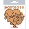 Pastease Brand Howdy Rope Heart Lasso Pasties. Howdy Cowboy Rope Heart Lasso Pasties Nipple Covers by Pastease. Introducing Howdy Pastease. Embrace the Wild West with a Touch of Sparkle! Yee haw, cowgirls! Saddle up and get ready to show off your true rodeo spirit in Howdy Pastease. This is not just any ordinary accessory. It is a bold statement that combines the rustic charm of the wild west with a touch of glitzy glamour. Features the word Howdy hand crafted in Bold Black Rope lettering, capturing the essence of genuine western hospitality. The heart is detailed in the same rugged rope design, giving it an authentic feel that you will only find out on the range. And what better way to set off this masterpiece than against the backdrop of our glittering velvet in a timeless camel color? The velvet brings an air of elegance, reminding us of those vintage saloons and ballrooms where cowboys and cowgirls twirled under the starry skies. The sparkling effect catches the light just right, ensuring you are the center of attention no matter where you go from line dancing at your favorite honky tonk to making a bold statement at any event or riding your favorite cowboy. Whether you are two stepping on the dance floor or riding the open trails, the New Howdy Pastease is the ultimate fusion of country heritage and contemporary style. So, giddy up and grab yours today to let your western spirit shine as bright as the Texas sun. It is time to say Howdy to a new era of country chic! Dimensions 3 inches by 2.7 inches. Coverage 2.1 inches. Authentic Western Charm. The word Howdy in black rope lettering brings an instant touch of genuine western hospitality, reflecting the warmth and friendliness of the wild west. Glittering Velvet Elegance. The classic camel-colored velvet background adds an air of elegance, reminiscent of vintage saloons and grand ballrooms, bringing together the old and the new in one stunning accessory. Sparkling Shine. The velvet has a glittering effect catches the light in a mesmerizing way, making you the star of your own rodeo. Heart shape pasties. Handcrafted wearable artistry. Meticulously hand crafted in the USA to capture the essence of the wild west.