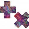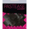 Petite Plus X Two Pair of Small Liquid Black Cross Nipple Pasties by Pastease are hand made in the USA of soft form fitting material that forms seamlessly to curves and resists wrinkling over hardening nipples. Just peel and stick on clean, dry skin. All Pastease feature latex free, medical grade, waterproof adhesive that stay securely in place for as long as you like and until they are gently removed.