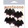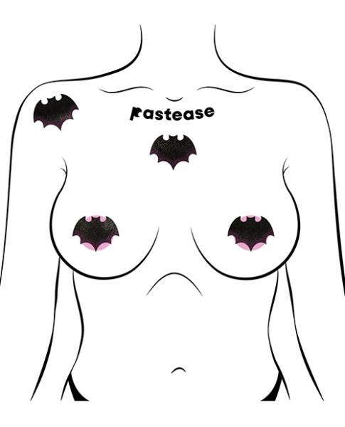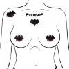 Pastease Small Liquid Bats. Petites: Two Pairs Small Liquid Black Bat Nipple Pasties by Pastease. Dimensions: 2 inches by 1.5 inches. Coverage Diameter: 1 inch. Unveiling the Petite Bat Pastease – a captivating accessory that brings a touch of dark elegance to your Halloween ensembles and gothic chic style. Embrace the allure of the night with four petite bats to accessorize your look, accentuate your style or wear as pasties. Featuring a shiny, liquid black finish, perfectly crafted to set your look apart from the rest.