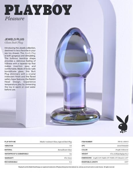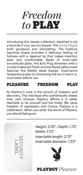 Freedom to Play: Introducing the Jewels collection, destined to be a favorite in your sex toy drawer. The Jewels Plug is both gorgeous and stimulating. The bulbous teardrop shape provides a delicious feeling of fullness with a tapered tip that makes ion easy and comfortable. Made of body-safe borosilicate glass, this Butt Plug shimmers with a crystal iridescent finish and the flared safety base features the Rabbit Head Design. Experience temperature play by immersing the toy in warm or cool water before use.