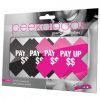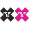 One black and one pink pair each of x-shaped pasties with pay up $$ on each. From Xgen Products.