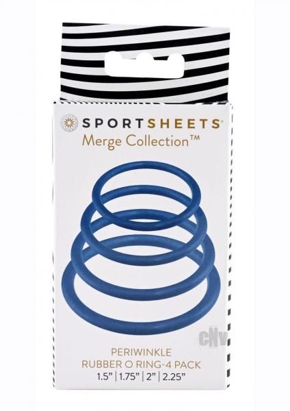 Periwinkle O-Ring 4 Pack from Sportsheets. The Sportsheets Merge Collection Rubber O-Rings 4-pack are firm yet stretchy, latex free rings in sizes 1.5 inches, 1.75 inches, 2 inches and 2.25 inches, giving you choices to personalize the ideal size and tightness that work best for your body. Mix and match sizes and vibrant colors to stabilize the base of dildos, wear on your penis and testicles to enhance stamina or to simply brighten up your strap on play. Merge with pleasure using the Merge Collections vibrant pack of O-Rings. Compatible with all interchangeable Strap Ons. Features: mix and match sizes and vibrant colors to stabilize the base of dildos. Wear on your penis and testicles to enhance stamina. Brighten up your strap on play. Limited Lifetime Warranty. Product dimensions: 1.5 inches O-Ring. 1.75 inches O-Ring. 2 inches O-Ring. 2.25 inches O-Ring. In the box: four pack of rubber O-Rings. Materials 100% Nitrile, 70 NBR rubber latex free. Video. 2021.