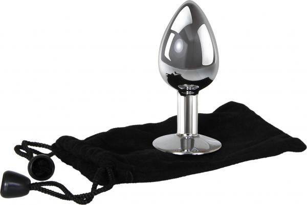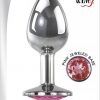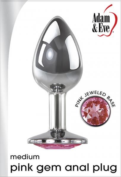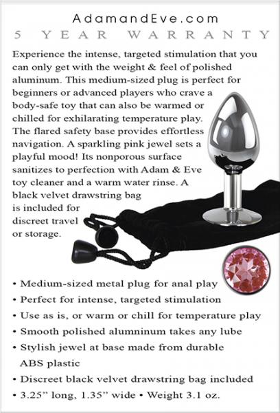 Pink Gem Anal Plug Medium from Adam and Eve Toys. Medium metal plug for anal play. Perfect for intense targeted stimulation. Use as is or warm or cold for temperature play. Smooth polished aluminum takes any lube. Stylish jewel at the base made from durable ABS plastic. Discreet black velvet drawstring included. Size 3.25 inches by 1.35 inches.