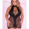 Yo, where would you get that HAWT dress? Duh, on the inter-net. Catch some big ones in this sexy fishnet, straps and choker neck mash up. Fabric content 92% Nylon, 8% Spandex. From Pink Lipstick. Color Black. Ladies plus size 1X/2X. Bust 43 inches to 50 inches. Waist 34 inches to 42 inches. Hips 44 inches to 52 inches. Cups D/DD. Dress sizes 16 to 22.