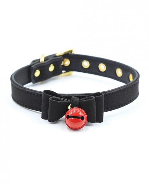Gift your precious kitty with their very own collar! The bell, bow tie accent, and jet black aesthetic lets your sub show off their inner submissive feline with a sultry style! Made with durable yet soft PU leather for comfort, especially useful for extended kitty play sessions. This bell tinkles with every spank, shiver and thrust! Wear around your home or during scenes to show off your inner submissive kitty. Gift this collar to your playmate as a symbol of your ownership and protection. The black, gold and red, perfect for the dungeon or a night on the town! The adjustable buckle fits necks from 12.8 inches to 16.5 inches for the perfect fit! Measurements: Overall length 19 inches, adjusts from 12.8 inches to 16.5 inches. Materials: PU Leather, Metal.