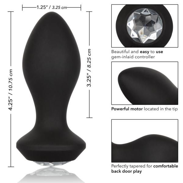 Features: Premium Silicone rechargeable anal probe. 10 intense functions of vibration, pulsation and escalation. Powerful motor located in the tip. Beautiful gem inlaid controller. Security travel lock feature hold for 3 seconds to turn on or off. USB rechargeable charging cord included. Complete charge in 2 hours. Runs for 1.5 hours on high speed and 2 hours on low speed. Dimensions probe 2.75 inches by 1.25 inches. Overall 3.75 inches by 2 inches.