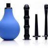 Measurements small tip 3.25 inches in length, .5 inch at widest diameter. Medium tip 4.75 inches in length, .5 inch at widest diameter. Large tip 5.25 inches in length, 1 inch at widest. diameter. Bulb is 5.5 inches in length and 4 inches in diameter. Materials PVC, ABS Plastic. Color Blue. Note includes bulb and three tips.