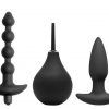 Measurements Bulb 7 inches in total length, 2.25 insertable, 3.25 inches in diameter. Plug 5 inches in total length, 4 inches insertable, 1.5 inches in diameter. Beads 7 inches in total length, 5.25 insertable, 1.15 inches in diameter. Materials Silicone, ABS plastic. Color Black. Note: Includes enema bulb, plug, beads, and bullet vibe. Bullet vibe requires 1 AAA battery, not included. Bulb holds up to 225ml of liquid