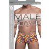 Mini shorts with low rise waist, high cut legs, features our contoured comfort pouch, full rear coverage. Multicolored festive rainbow print in a herringbone pattern. Stretchy and breathable, lightweight poly Spandex. Fabric 85% Polyester, 15% Spandex. From Male Power Underwear. Color Rainbow, Mulit-Color. Men size medium. Waist 32 inches to 34 inches.