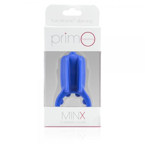 Screaming O Primo Minx Vertical Vibrating Ring with Vibro Fins Blue. The Primo Minx is the latest of Screaming Os Primo affordable luxury collection, bringing couples a new 100% True Silicone cock ring with an extended, extra long vertical motor. This powerful 3 speed plus pulse motor is strategically positioned vertically to stimulate more surface area and cleverly cradles the clitoris between two firm silicone fins for an all encompassing experience. These fins transfer vibration to their tips for a titillating oscillating sensation that intensifies pleasure wherever they touch.