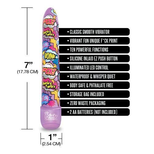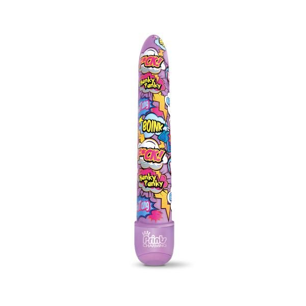 Prints Charming Pop Tease 7 inches Vibe F*ck Purple Classic Vibrator from Global Novelties. Classic smooth vibrator with a fun unique print. Ten powerful functions with a silicone inlaid easy push button and illuminated LED control. Waterproof and whisper quiet, body safe and phthalate free. Storage bag included, zero waste packaging. Size 7 inches by 1 inch. Vibrator requires 2 AA batteries, not included.