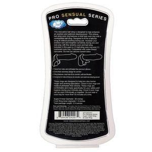 Pro Sensual Pro Rings Silicone Super 8 Ring and Tie Sling 2 Pack. This innovative ball sling is designed to help enhance an erection and optimize staying power. This unique ball sling cock ring features a dual hole cock ring with a comfortable ball sling. Designed to fit for a tailored, snug fit without pinching during use. Increase your erection size and heighten sensitivity during sex and solo play with this stretchy cock and ball sling. Included in this pack is 1 ball sling cock ring and 1 over sized cock ring.