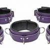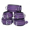 Measurements wrist cuffs fit between 6 inches to 13 inches in circumference, ankle cuffs fit between 10 inches to 15 inches. Collar fits necks between 12 inches and 16 inches. All pieces are 2.25 inches in width. Materials Leather, Brass. Colors Purple, Black. Note set does not include locks or connecting chains. Warning: This is a NEW item that is not in retail packaging, usually a plain box, wrapped in plastic or a poly bag.