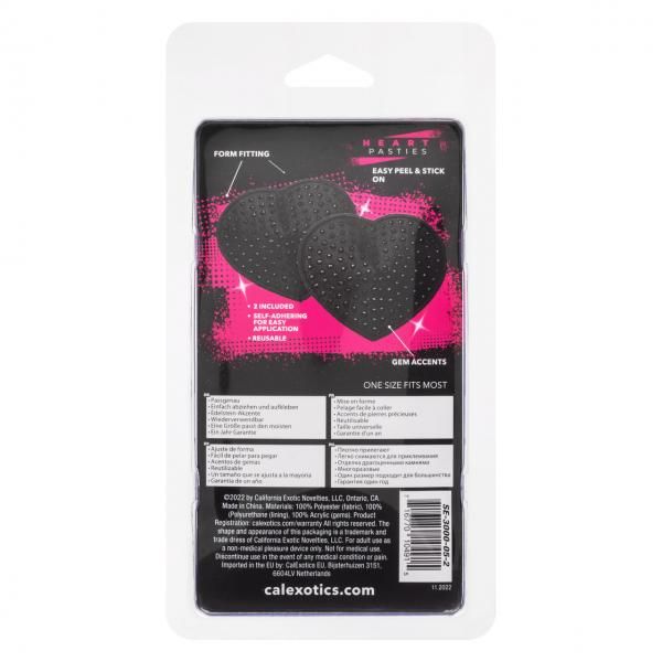 2 form-fitting pasties with gem accents included. Easy peel and stick application. Reusable.