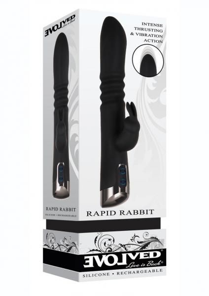 Rapid Rabbit Tall, dark and handsome alert! This powerful thrusting vibe features a mid-shaft ribbed accordion section that pushes erotically outward in the sexiest way, mimicking the real thing only here you control the speed! Add to that two separate 7-speed vibration motors one in the main shaft head and one in the clitoral bunny and you`ve got a date with the hardest-working toy on your nightstand! Designed to send waves of pleasure inside and out, you can get as wet as you want with this toy as it`s completely water submersible! Thrusting dual rabbit vibe Main shaft thrusts up to .5 Powerful vibrating motor in head Separate motor in rabbit stimulator Both motors work together 3 thrusting speeds 7 vibrating speeds and functions Made from supple silicone Black chrome finished ABS plastic handle Blue LED lights in buttons when in use Height: 10, Depth: 2.75, Width: 1.59 6 able shaft Thrusts .5 Weight: Over .5 lb Waterproof andamp; submersible Phthalate andamp; latex free Rechargeable, USB cable included Clean with Evolved Toy Cleaner andamp; warm water