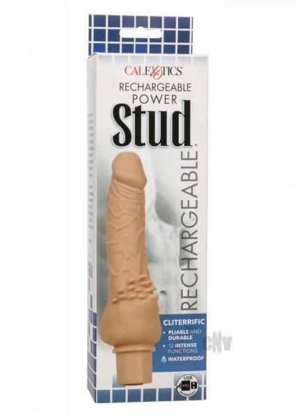 Rechargeable Power Stud Cliterrific Ivory Vibrator from California Exotic Novelties. Thrust yourself towards earth shaking pleasure with the rumbling Rechargeable Power Stud Cliterrific. The power packed extra large vibrator features a flexible real feel design and 12 functions of vibration. The flexible, yet rigid shaft and soft supple Silicone deliver a truly realistic penetration experience. The powerful motor located in the tip of the massager delivers deep, rumbling vibrations. Whether you are taking a dip with a lover or indulging in a steamy solo session, look forward to up to 1 hour of waterproof vibration. Recharge pleasure and get back to play time in only 1.5 hours with the provided USB cable. Embrace up to 1 hour of vibrations on low speed and 30 minutes on high speed. The flexible massager is made from a hygienically superior silicone. The body safe material is unscented and phthalate free to keep your most sensitive spots happy and healthy. Specifications: SKU SE-0842-25-3. Color Ivory. Power source USB Rechargeable, included. 1 year warranty. Material type: PVC Plastic, Silicone, ABS Plastic. Features Phthalate Free, Waterproof vibrations, Rechargeable, Vibrates. Measurements: 7.5 inches by 2.5 inches vibrator. Bulk weight 6.7 ounces. Package 8.5 ounces. Package 2 inches by 3 inches by 10.5 inches.