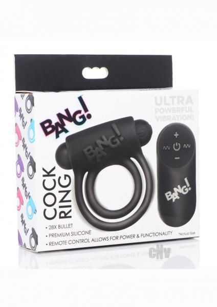 Enhance your cock with this velvety silicone ring and vibrating bullet combo! This Cock Ring from Bang! features two stretchy rings, one for your shaft and one for your sack, to increase erection hardness and duration while providing a satisfying hug. This powerful silicone ring also features an intense bullet vibe strategically placed to stimulate your lovers clitoris with every thrust! Choose from 4 speeds and 7 patterns of vibration to buzz your shaft and balls, pleasuring yourself and your partner with an added layer of pleasure to your usual sexy routine. Make use of the included remote controller and change things up on the fly to keep things fresh! This sultry ring is made with premium, velvety smooth silicone for a luxurious feel for both you and your partner. These rings are phthalate free, body safe, and waterproof so you can play worry free! Recharge the vibrating bullet when the power runs low with the included USB charging cable. Measurements : Overall size 3 inches x 3 inches, small ring inner diameter 1.25 inches, large ring inner diameter 2 inches. Bullet dimensions 0.8 inches x 3 inches. Materials : Silicone, ABS Plastic Color : Black
