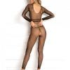 Look sexy from head to toe in this fishnet bodystocking featuring a high neck, long sleeves, a scoop back, an open crotch, a strappy adjustable harness, and a matching panty. Ladies sizes medium to large, M/L. Bust 34 inches to 38 inches. Waist 26 inches to 30 inches. Hips 36 inches to 40 inches. Cups B/C. Dress sizes 10 and 12.