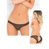 Look irresistible in this open back crotchless bikini. Eliminate VPL with scalloped flat lace leg bands. 4 inches ultra low rise. Sheer, stretch lace. Content body 90% Nylon, 10% Spandex. Color Black. Ladies sizes small to medium, S/M. Waist 24 inches to 28 inches. Hips 34 inches to 38 inches. Dress sizes 4 to 8.