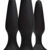 Three assorted sizes of firm, flexible and tapered plugs designed for effortless penetration. Velvety soft to the touch, these satin finish toys are easy to clean and safe to use with any lubricants. Each features a strong suction cup base for creative sexual fun.