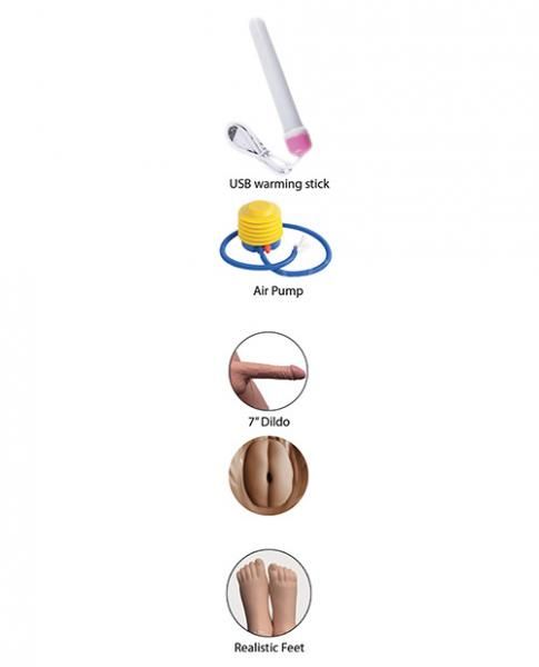 Features: dildo is 7 inches long and 5.25 inches in girth. Penetrable anus measuring 6.5 inches deep. Realistic contoured shape. Vibrating dildo function. Realistic feet and hands that wraps around you. USB warming stick included. Free repair kit included. Free air pump included.