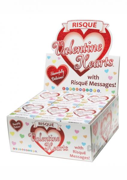 24 Box Display. Each individual box has approx. 25 heart shaped candies imprinted with a risqué message.Get in the mood with these Risqué messaged candies.
