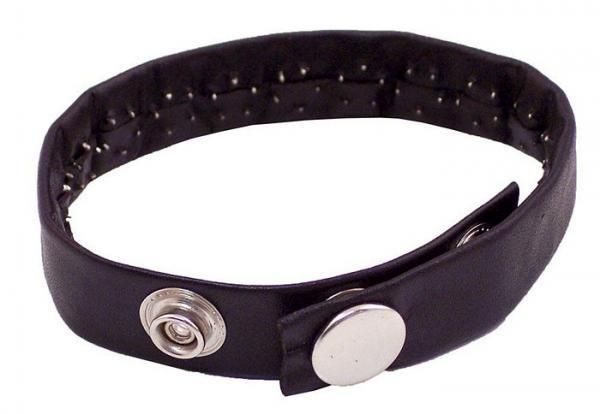 Cock strap with pin pricks on the inside and three snap buttons for different sizes.