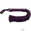 Leather flogger with shorter handle and leather hand loop. Color Purple.