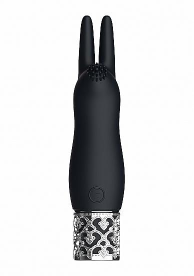 Royal Gems Elegance Black Rechargeable Silicone Bullet Vibrator from Shots Toys. You do not need to be royalty to enjoy this elegant line. Hidden beneath its silky smooth medical grade Silicone exterior lies a pedigree unmatched. Elegance vibrating ears and massaging cushion make it super versatille. The magnetic fully rechargeable proprietary New Generation F-1 motor design delivers mind blowing vibrations uniformly across the full surface of the toy. Do not settle for the common, choose to be royal. Dimensions package 3.94 inches by 1.34 inches by 6.5 inches. Weight package 6.38 ounces. Product dimensions 4.65 inches by 1.06 inches. Product bulk weight 1.76 ounces. Product diameter 0.91 inch. Quantity motors 1. Rotations vibration tip 10,000 RPM. Speed modes 10. Multi speeds of vibration. Noise level 45 dB. Rechargeable vibration. Rechargeable time 120 minutes. Recharged battery life time 60 minutes. Waterproof vibrations. Splashproof for play in the shower. Phthalate free body safe materials Silicone.