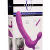 This silicone strapless strap on brings pleasure to both you and your partner! Whether you are using it for pegging or sex between two females, this carefully designed dildo will enhance the experience with the exciting shape and powerful vibration. The bulb allows you to experience vaginal penetration while your clit rubs sensually against the three ridges of the clitoral pad. The long shaft has comfortable girth with a raised design to massage your partners orifice. The prominent head and slight curve are ideal for G-spot or P-spot stimulation. An extra long vibrating bullet will send buzzing bliss into both partners for greater satisfaction. This bullet can also be removed to tantalize on its own. Made of premium silicone, this double dildo is non-porous and phthalate-free. Avoid use with silicone lubricant and clean with mild soap and warm water. Measurements: 9.75 inches in total length. Up to 7 inches insertable shaft length, 1.5 inches in shaft diameter. 3 inches insertable bulb length, 1.5 inches in bulb diameter. Material: Silicone, ABs plastic. Color: Purple. Note: Requires 1-AAA battery, not included.