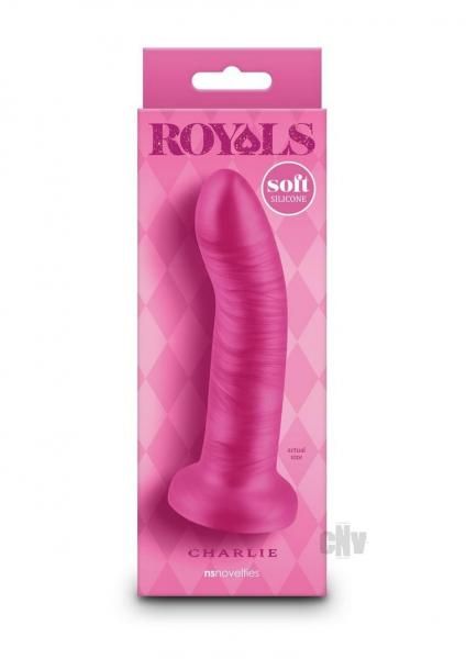Experience a Queen`s Delight with Royals: a collection of exquisite dildos, each finished with a shimmery metallic plush silicone coat and featuring strong suction cups designed for secure attachment to any smooth surface. Charlie 5 is a curved dildo. Royals are body-safe and compatible with all lubricants including silicone. Waterproof Rating -IPX8.