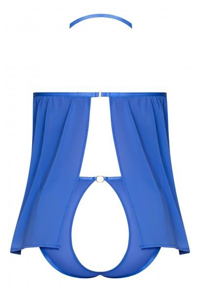 Sassy Cupless Babydoll and Panty Set Cobalt Blue from Magic Silk Lingerie Exposed collection. Item: Magic Silk Cupless Babydoll and Crotchless Panty Set M259. Colors: Black, Cobalt. Sizes available: S/M, L/XL, Queen. From the Exposed by Magic Silk collection, this style includes: a cupless babydoll featuring a flowy, non-restrictive hip length design with an open flyaway back, an elastic and adjustable halter strap with gold tone sliders, and swan hook closure at the neck and back, gold tone O-ring details throughout, and a matching crotchless and open back panty featuring soft bikini style sides. Collection: Sassy. Fabric feeling: soft, stretch mesh with sleek gold metal details. Fabric content: 92% Polyester, 8% Spandex. Care instructions: hand wash, cold water. No bleach. Dry flat. Categories: Ladies sizes 20 to 22. Plus size extra large. Women dress sizes 1X to 2X. Magic Silk Women’s Sexy Lingerie. U.S Lingerie Company, Ladies Intimate Apparel. 2022.