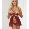 Two piece babydoll set. Satin jacquard and dot mesh babydoll with flyaway front, underwire, satin ribbon bow, front closure, and g-string.